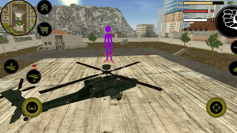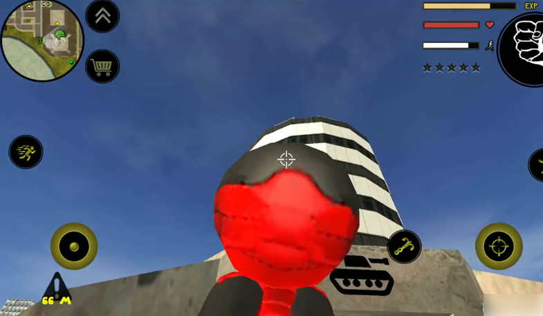 左侧移动、加速,右侧绳索,攻击(跳跃),跳跃,右上侧的武器更换以及血量、经验的显示都实时更新,一览无遗,凭借着大家自由的玩法,与其他帮派的人物进行交火,期间杀人能够获得经验,杀多了会产生星级,警察和其他附近角色会特殊照顾你对你展开火热的进攻,而如何存活,如何将其他人物击杀则是你所需要完成的任务。