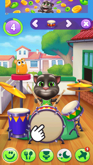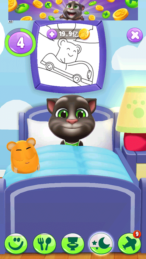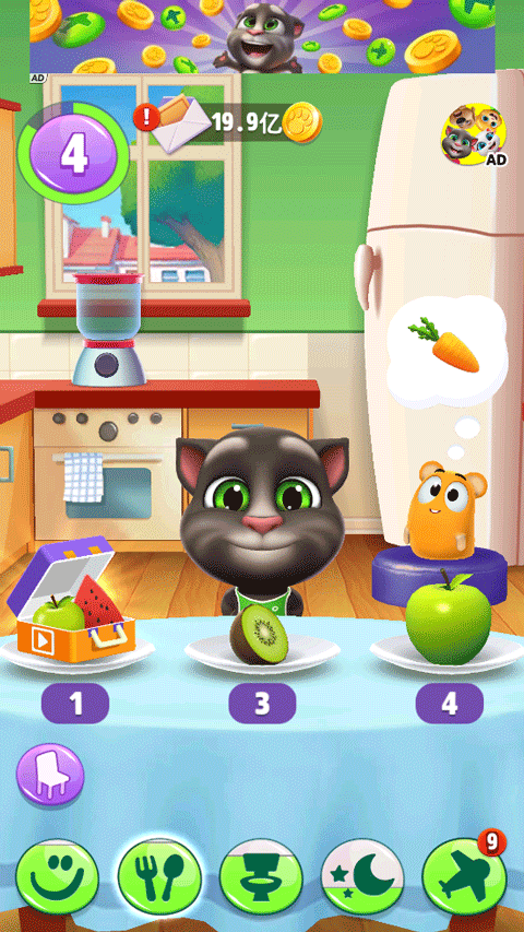 3、其实游戏中喂汤姆猫吃饼干、冰淇淋,帮它洗澡让它睡觉,它就会升级,升级的时候就会送出金币,这才是获得金币最容易的途径。