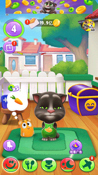 1、下方对应的四个四个区域对应汤姆猫的各种养成玩法,有开心程度,饥饿程度,精神程度,干净程度,需要如果数值变低,汤姆猫的心情也会变化。