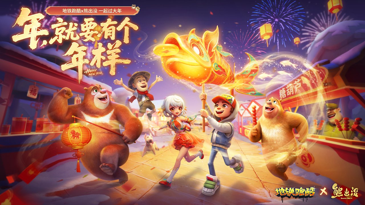 熊熊袭来,陪你一起过新年!熊出没经典角色光头强、熊大、熊二、吉吉国王、天才威加入春节庙会,更有神秘联动角色大年初一与电影同步现身地铁跑酷!联动角色使用喷气背包时,可以解锁限定蜂蜜罐喷气背包!联动挖宝活动“寻宝狗熊岭”火热开启,用锤子敲开隐藏宝物、点亮狗熊岭地图,熊出没联动限定角色天才威等你来拿!