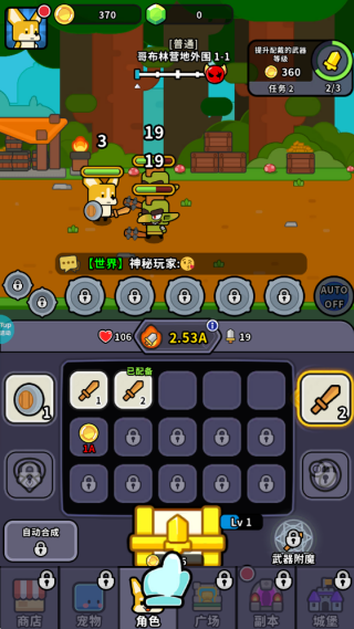首先这个游戏是通过开箱出装备,装备两两合成出一件高等级装备。玩这个游戏可以连点或操作录制加速打开宝箱,快速合成高等级装备来提升自己的战斗力。优先升级武器,然后是戒指。戒指给的攻击力没武器多。被怪打死后就提一下盾牌等级,打得过就不用升,全部提升攻击,提高推图效率。