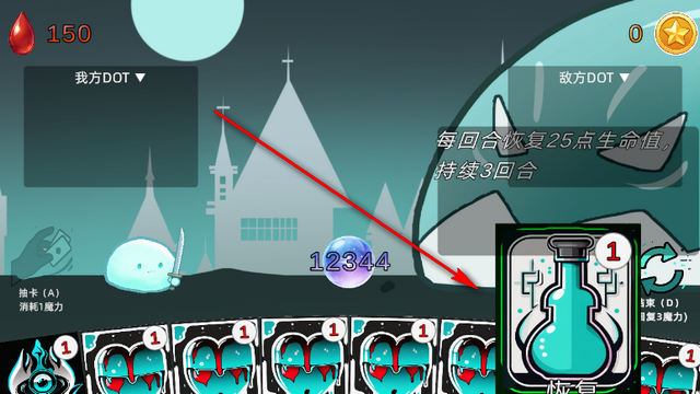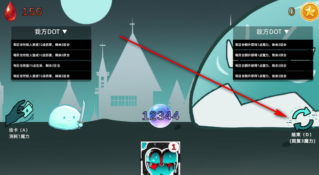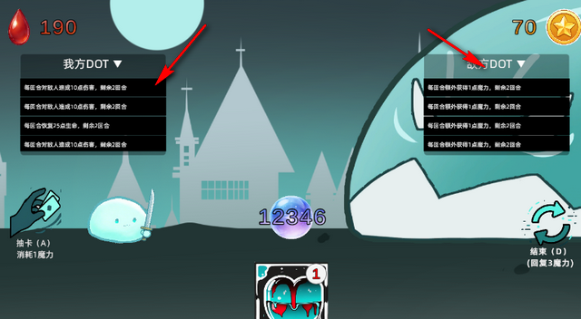 1、游戏界面无多余 UI 与剧情,所有信息聚焦于血条、DOT 层数、魔力、手牌。