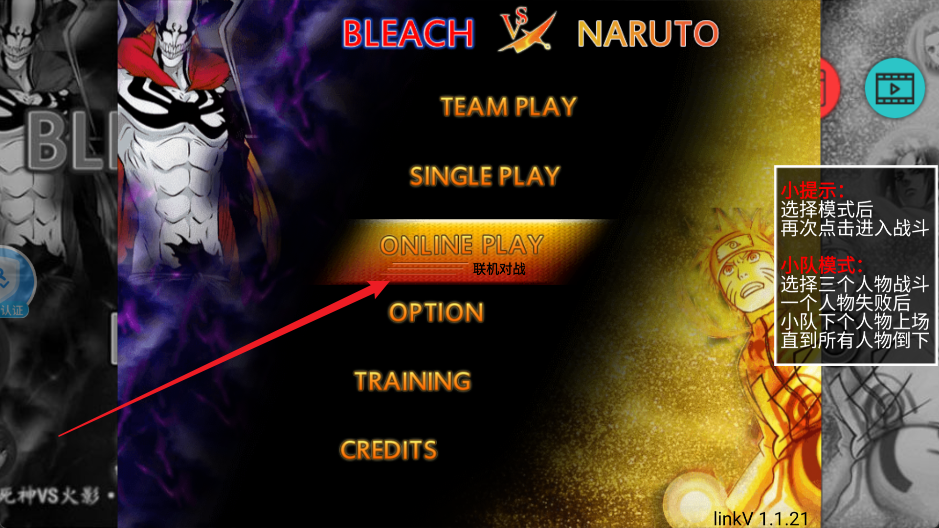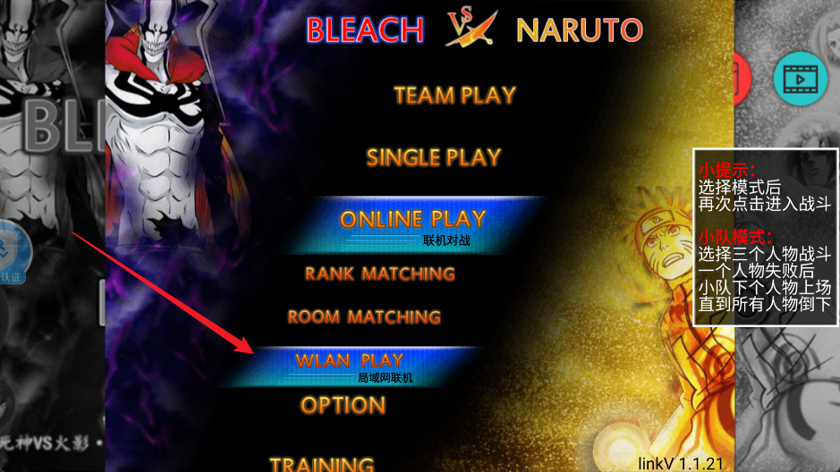 1、打开死神vs火影,进入选择玩法模式,小队模式TEAM PLAY、单人模式SINGLE PLAY、无双模式MUSOU PLAY。