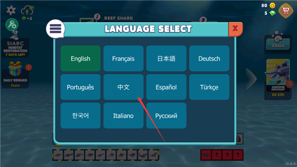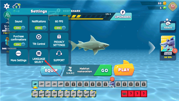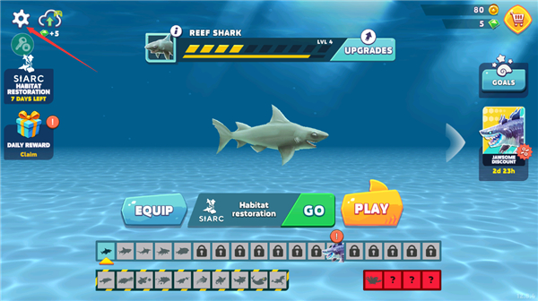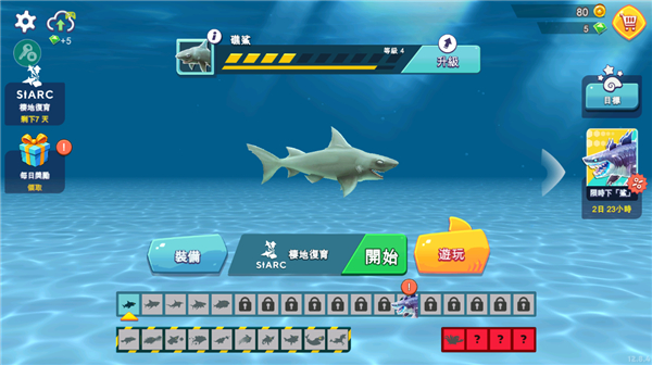 4、完成50个任务,寻找宝物取得金币与宝石,用来升级你的鲨鱼或者购买特殊救生道具。