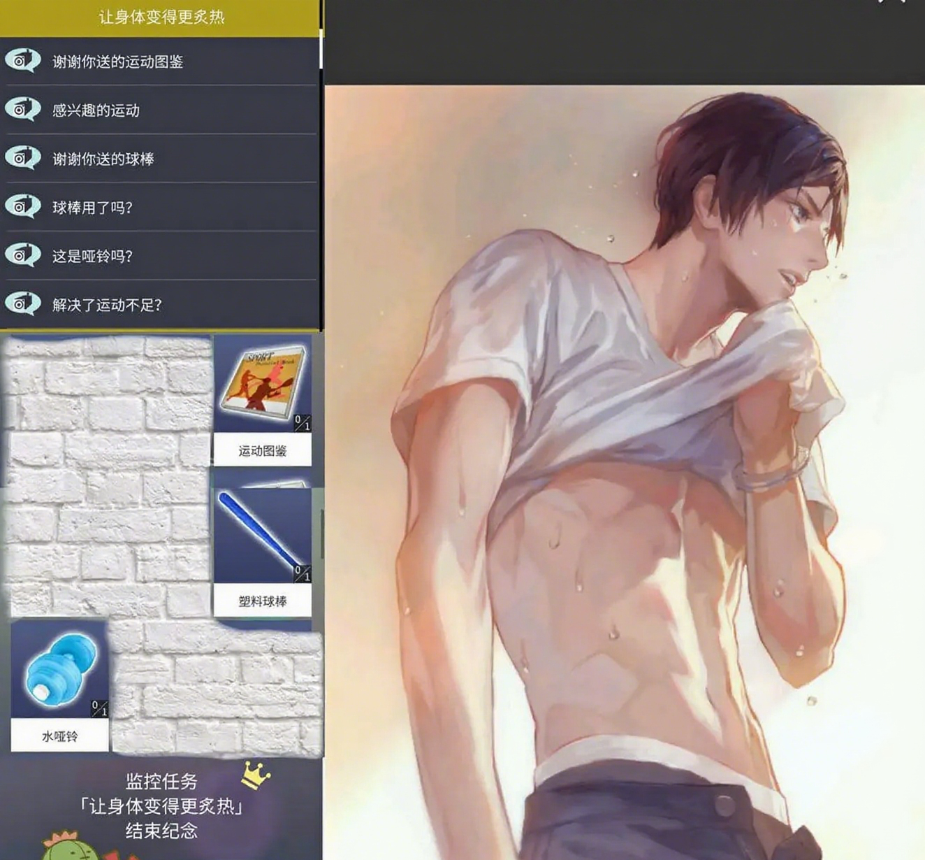 杂货店处购入「运动图鉴」「塑料球棒」「水哑铃」。