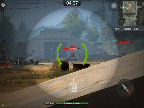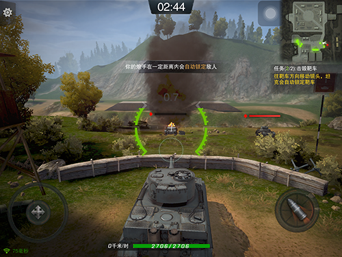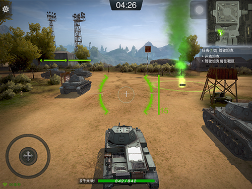 最开始的就是移动视角和位置移动,不过由于坦克本身的移动方式和我们日常玩的其他游戏角色不同,在适应上是需要时间的,特别是在转弯的时候,将摇杆往左或者往右摇分别是坦克原地逆时针和顺时针的旋转。